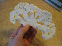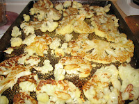 Preheat the oven to 375 degrees. Cut cauliflower into flat slabs, & lay them onto a rimmed baking sheet. When the sheet is covered, brush olive oil all over the cauliflower and sprinkle it with sea salt.