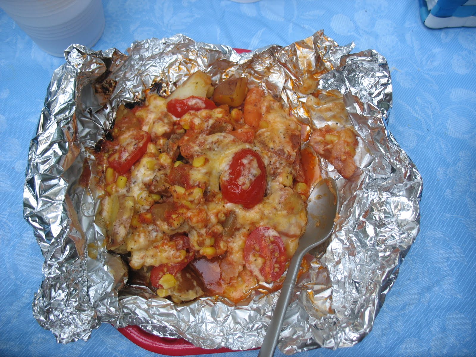t home if possible), 1/2 lb. bacon (chopped, not cooked), corn (1 can), potatoes (1 can or pre-cooked & sliced 3-4 potatoes), green beans (1 can), spaghetti sauce (opt., about 1/4 cup/person), cherry tomatoes (halved) shredded cheese (about 1 cup), spices (salt, pepper, garlic powder, Italian seasoning to taste OR a sprinkling of French Onion Soup Dry Mix). Add everything BUT CHEESE prior to sealing & cooking. Add cheese when done.