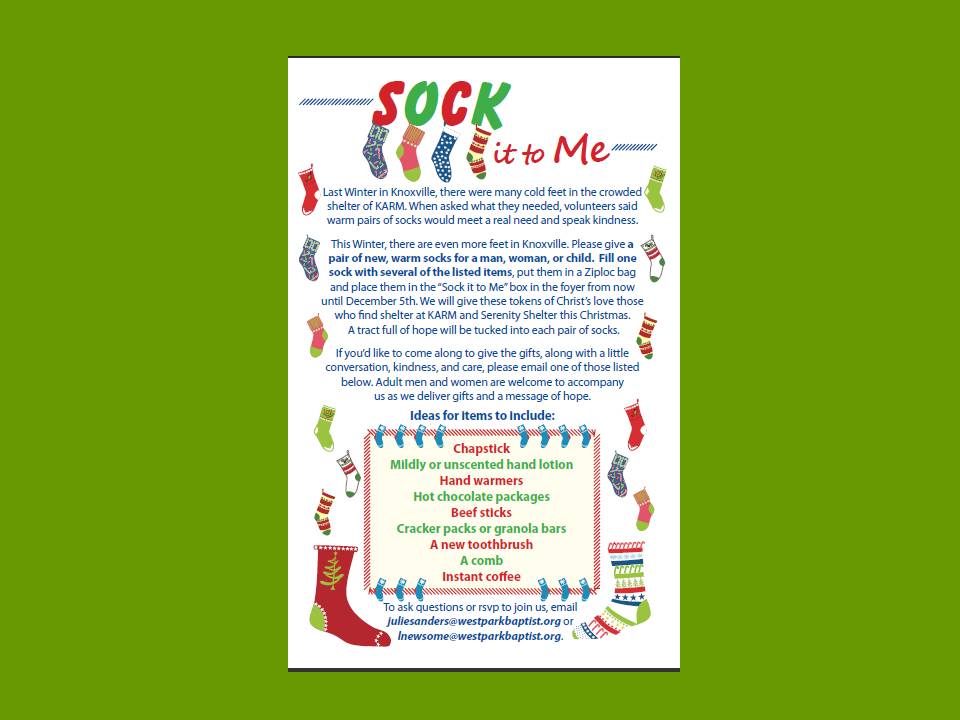 Because of the economic struggles this year, so many more people are discouraged and in need of help. Homeless shelters are bursting at the seams with people taking refuge there; those works are stretching resources to feed, clothe, encourage, and help. We are blessed to partner with Knox Area Rescue Ministries; the faithful servants there show God’s love in tangible ways every day, 24 hrs a day, 365 days a year. When a group of women visited last Christmas to deliver gifts to the overnight women guests, we asked what would be a helpful gift to receive. They said socks. Warm winter socks.
