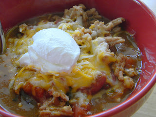 If you want to use beef instead, you may just need to drain the meat before you add spices, etc. We ate this with tortilla chips on the bottom of the bowl, then chili on top, then shredded cheese (your favorite variety) and a blob of low-fat sour cream. Awesome for a winter day!