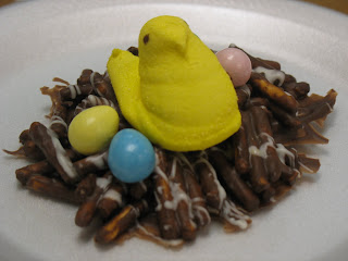 Last night I went to the Serenity Shelter for women, and among other things, we had fun making these simple, fun, and yummy Easter treats. All you need is chocolate (white or dark), stick pretzels, peeps, and egg shaped jelly beans or m&ms.