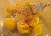 - Mash the yolk with the mayo, mustard, and spices.