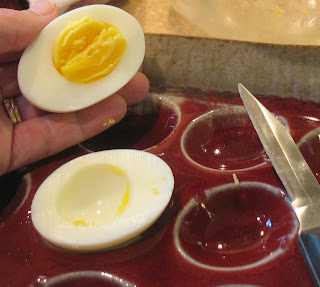 - Slice eggs in half lengthwise and scoop out the yolk.
