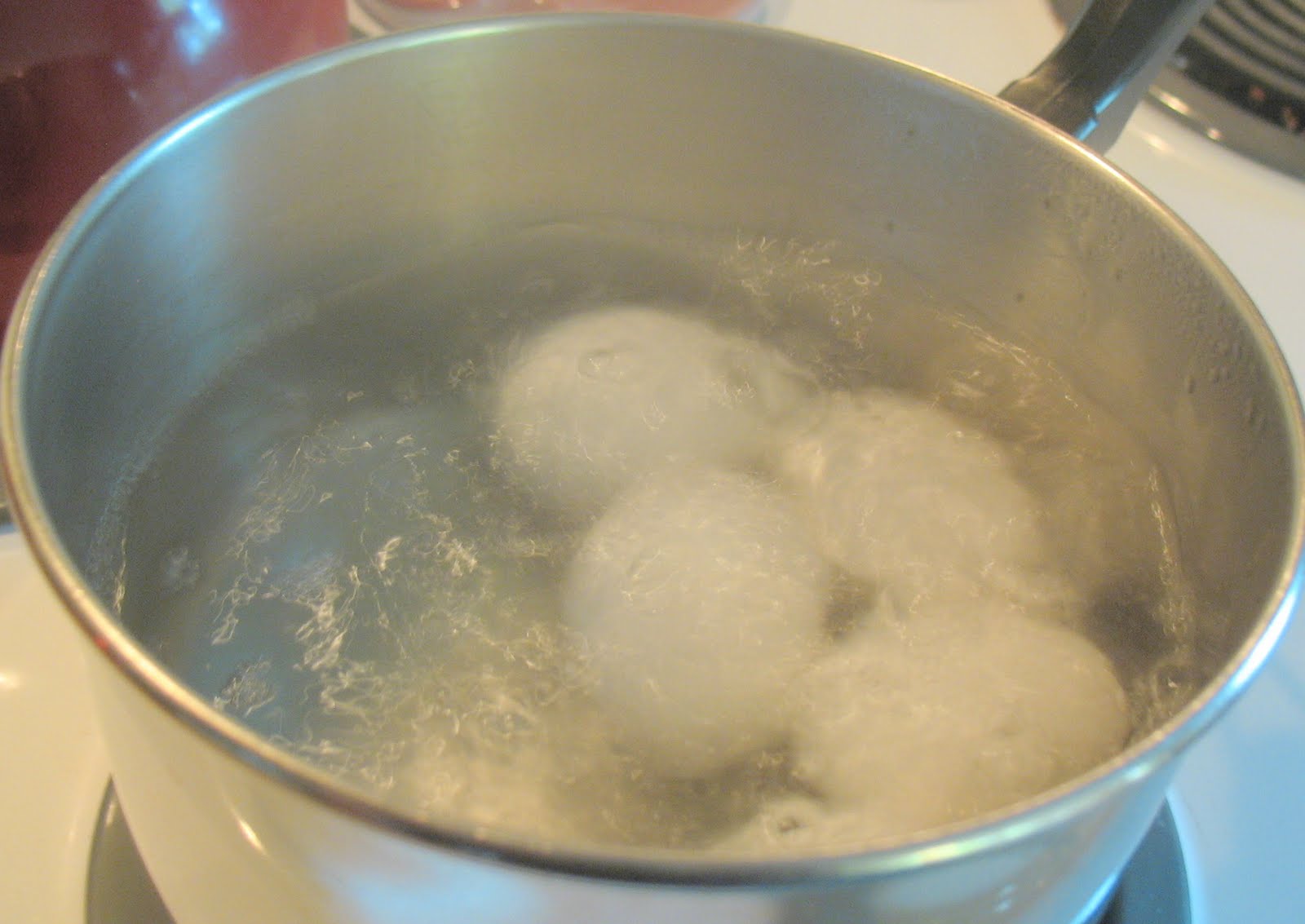 - I boil the eggs this way: Put eggs into a pan of room temp water, covered with water.