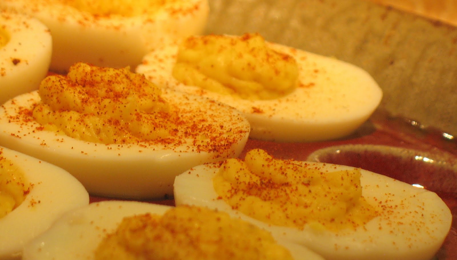 - Use paprika on top by TAPPING, not shaking (this really is key) a little paprika over each egg.