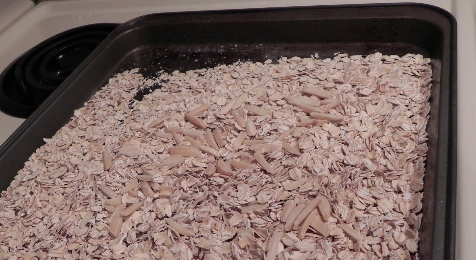 - Spread the oats (and chaser if needing toasting, such as millet or almonds) onto a deep dish baking pan. Place pan into oven.