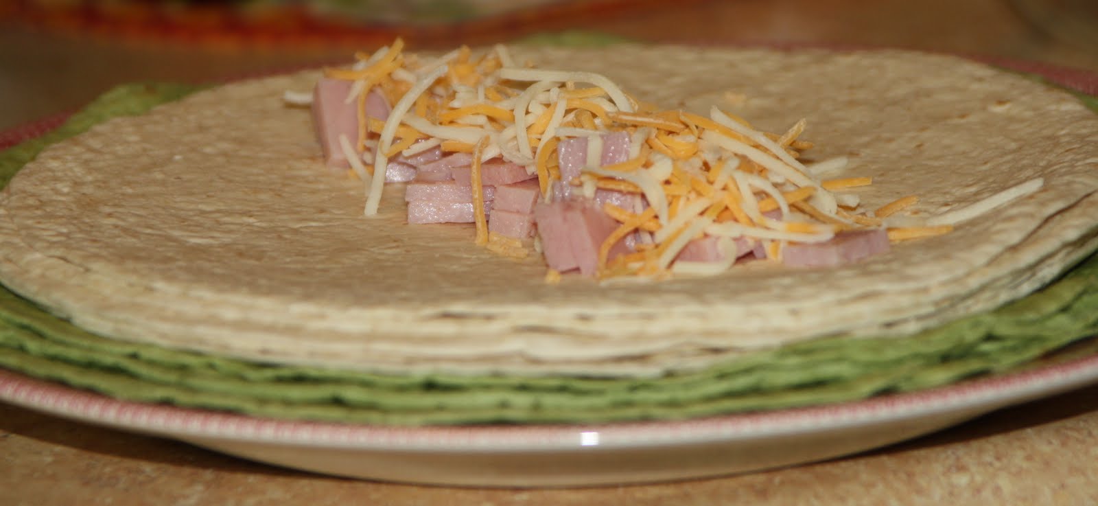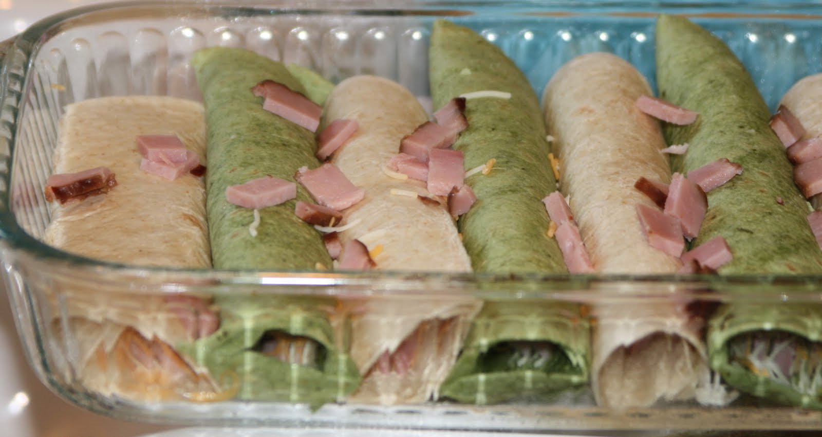 - Separate meat into equal portions for your tortillas. Put meat down the center of each tortilla and top with about 2 T. cheese. Roll up and place them seam side down in a greased 13×9 pan.