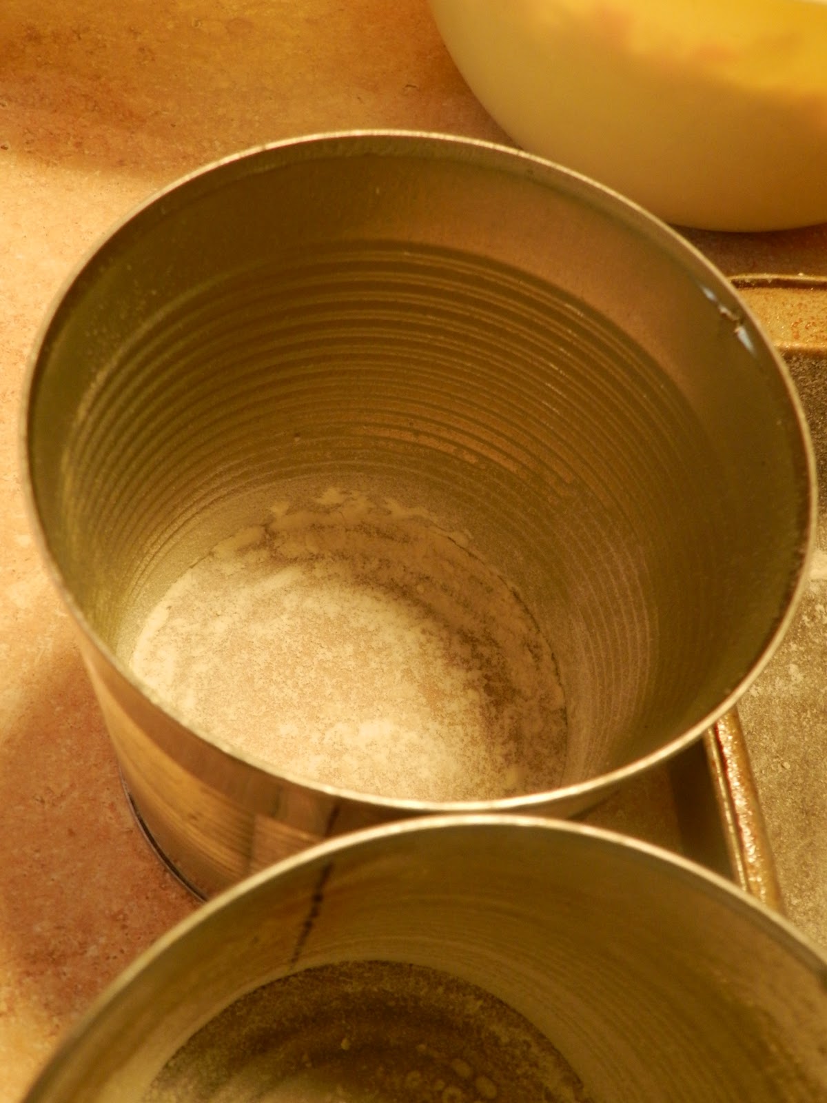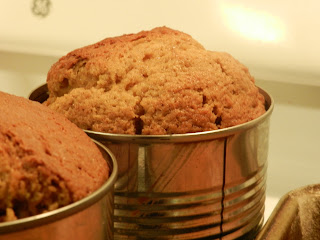 Grease pans well; I like to dust with flour, too. Put equal portions of batter into 3 baking pans or cans. Bake for 1 hour at 350 degrees. Cool well on a wire rack, then slide a sharp knife around edges to loosen. I “shake it” gently on all sides before trying to dump the load out of the can. One can had “leftovers” hanging on inside … a hovering teenager gobbled up the pieces that fell out. 🙂