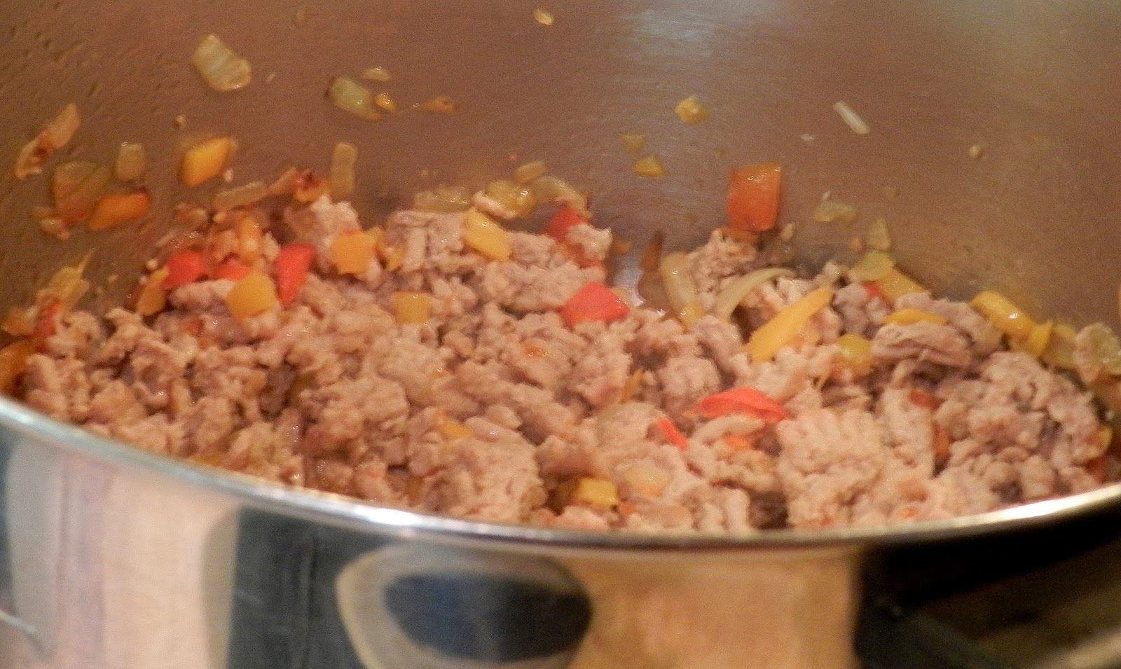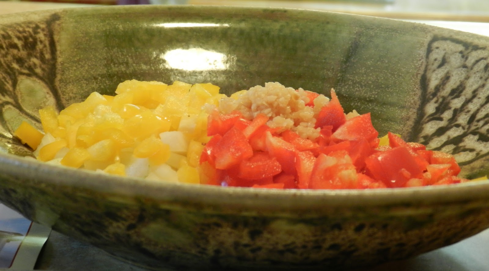 Saute the onion, peppers, and garlic in the oil til soft. Beautiful!