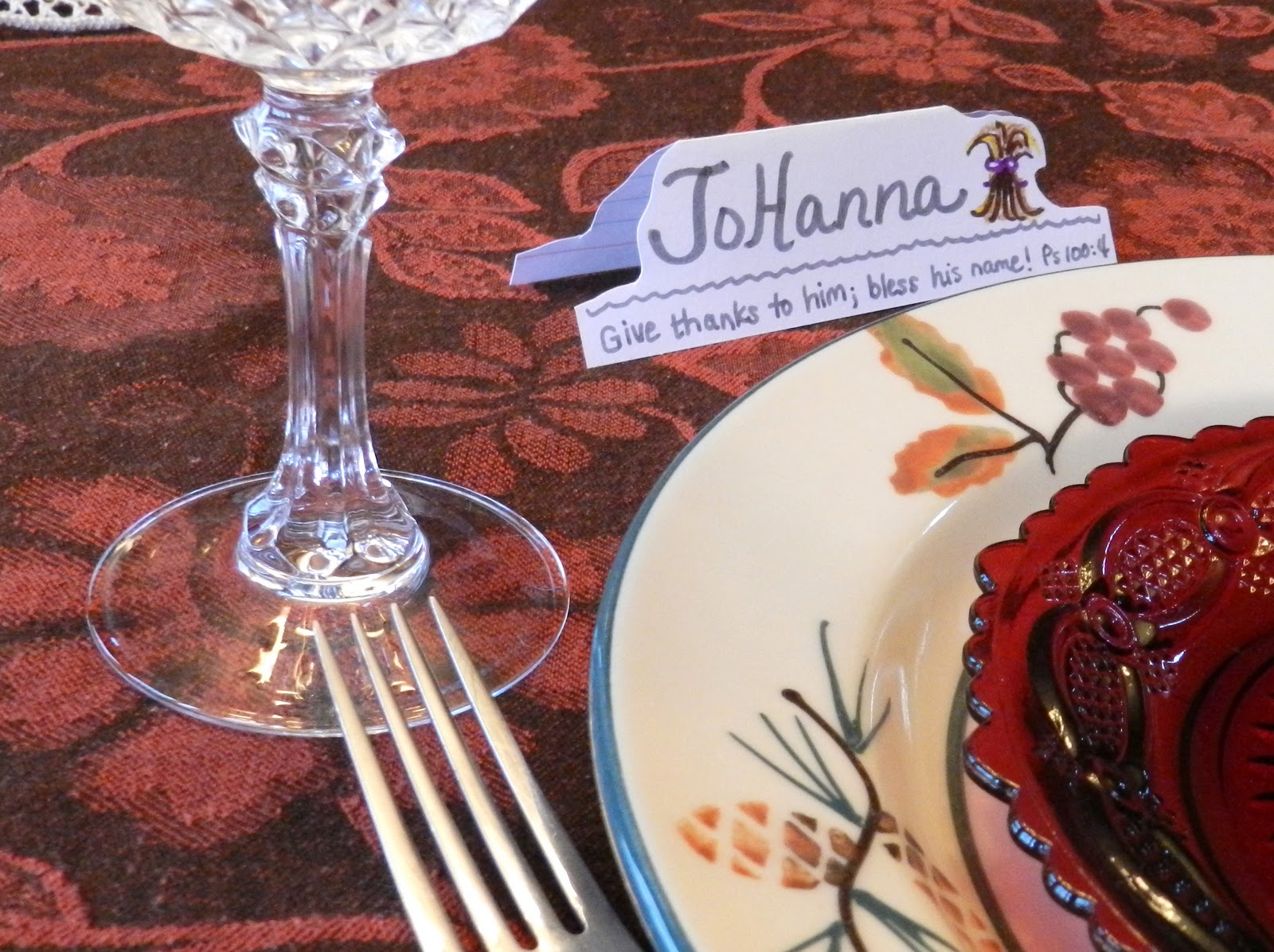 Idea #3 ~ Placecard at the plate.I folded the card in half long ways, wrote an excerpt from a thanksgiving verse along the bottom, and added the name as the centerpiece. You could also use stickers, stamps, or fingerprints to decorate. Namecards are PERFECT projects to have children join in with set up and stay busy. I cut around the end of the name & decoration to make it a little more special. I like to place them at the top of the plate, and this avoids uncomfortable moments of “Where do we all sit?”
