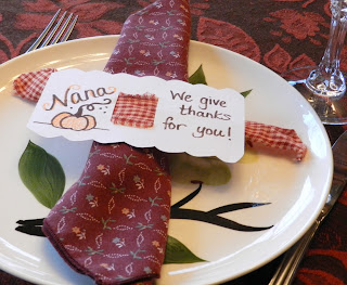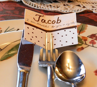 I folded the card in half long ways, then made a small cut on either side of the center. I wrote the name on the left and a personal “love note” on the right and added a little coloring. I took a strip of left over fall colored material (ribbon works too) and threaded it through the card and around the back of a gathered cotton napkin (paper works too). I tied it in the back to lay on the plate.