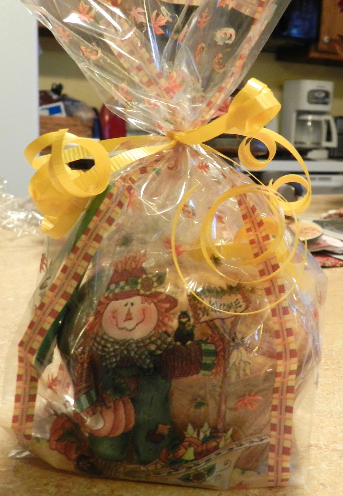 I took one of my biggest muffins, put a special tea bag with it, arranged them in a fall themed plastic bag, then tied it all up with 3 strands of curled ribbon. All ready to deliver a personal coffee break and a blessing to a friend in need!