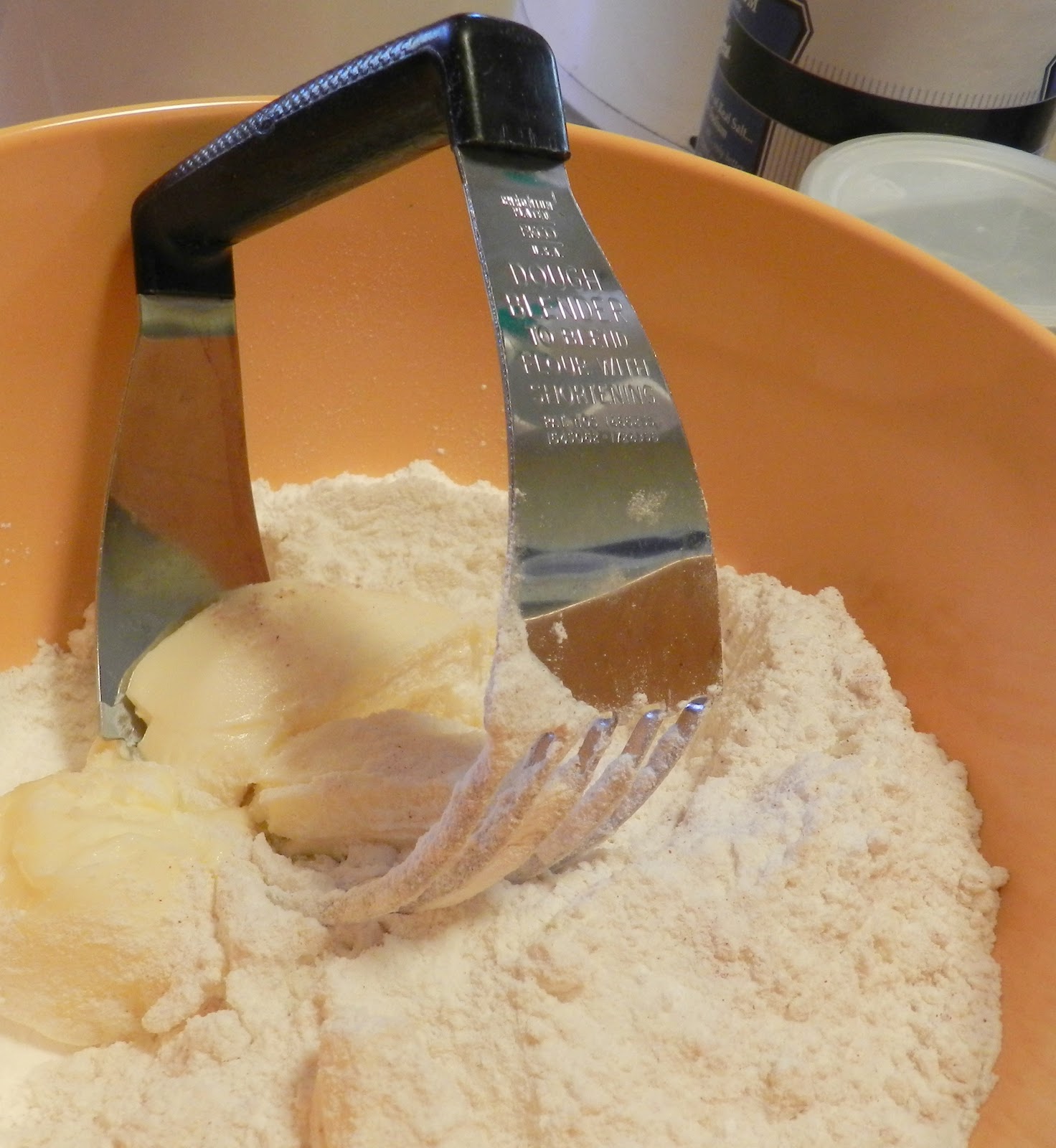 Stir until combined, but don’t over-stir (gets dry). Pat out to about 1/2 – 3/4 inch on a lightly floured surface. Use a floured glass to cut and twist biscuit dough.