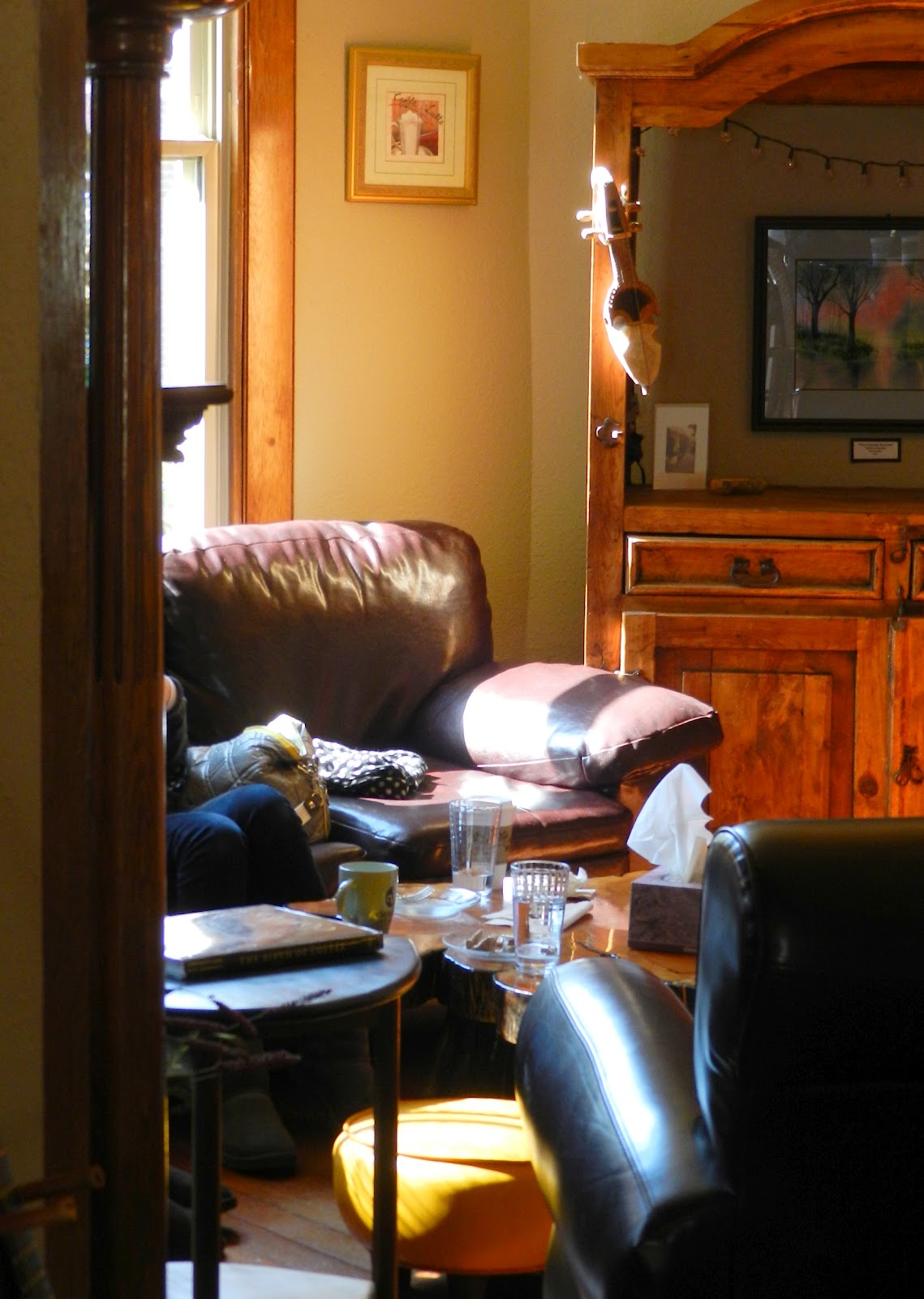 Two women with a baby sit under the mantel, chatting like people who practice talking softly while a baby sleeps. From my view two other women pairs are deep in conversation. One twosome both have night black hair and slanted eyes, and they talk fast and close in a language different from any other in the store. Maybe they made the counter woman grouchy. Glasses and cups fill the table in front of them, like they want to settle in and stay for a while.