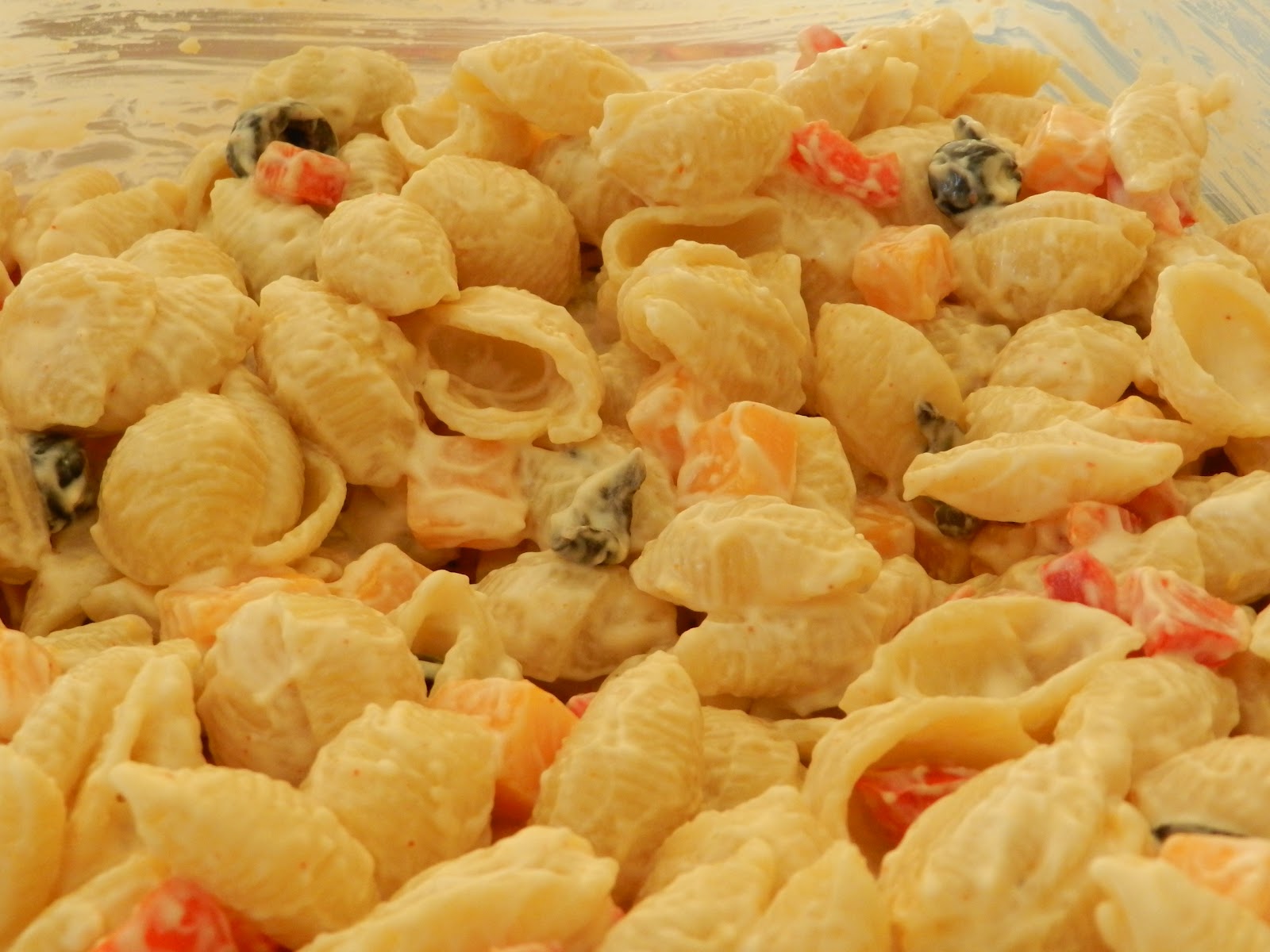 When the pasta is done and stops steaming, drain it well and dump it in the bowl you’ll mix it in. While it’s still hot, sprinkle the cheese cubes (and I also do the peppers/olives) all over it, so that they melt just a little and stick to the pasta. Jeff says THIS is the secret. 🙂 I discovered the “secret” when I was in a hurry, and went ahead and dumped the cheese in, so I could pop the bowl in the fridge and run. What I thought was an “oops” turned out to be a secret step … and a time saver! LOVE THAT!
